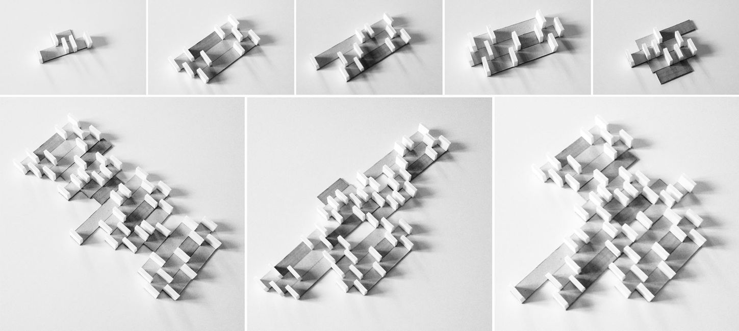 Je continue à travailler sur la même proposition, en me concentrant cette semaine sur l'échelle humaine. Je change sans cesse l'échelle de travail, parce que je trouve que ce type de projet doit penser tantôt à l'échelle humaine comme à l'échelle urbaine. J'ai déjà une idée sur la forme générale: je voudrais que, même si nous devions partir d'un terrain rectangulaire, ce rectangle se modifie en supportant les vibrations dues au contexte et aux différents caractères du site. Mais, pour savoir la forme finale, je dois étudier premièrement les modules et comment ils peuvent se relier entre eux.